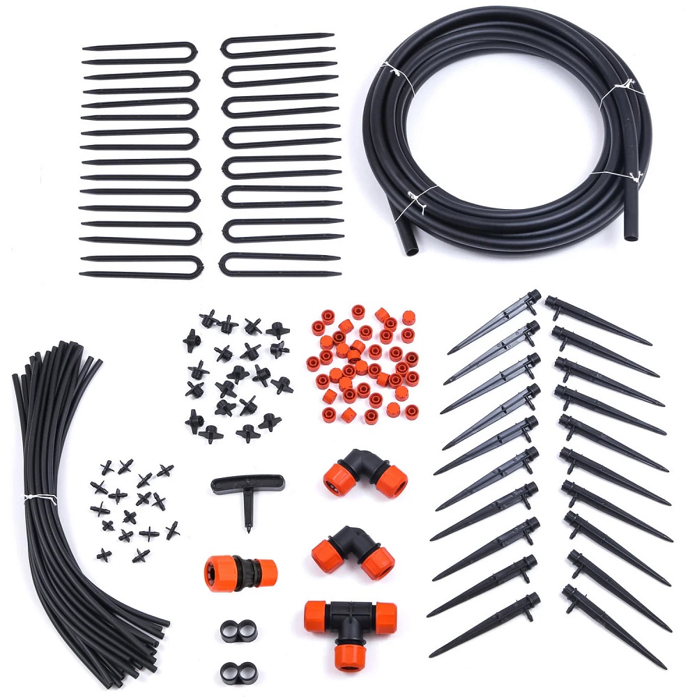 Система укомплектована всем необходимым — в набор входит не только магистральный шланг и микродождеватели. Это полностью укомплектованный набор, включающий в себя все необходимые аксессуары для монтажа системы и ее эксплуатации. Вам может понадобиться только нож для разрезания магистрального шланга. В комплекте уже имеются необходимые зажимы, уголки, тройник, соединительные муфты и даже специальное шило для прокалывания магистрального шланга.