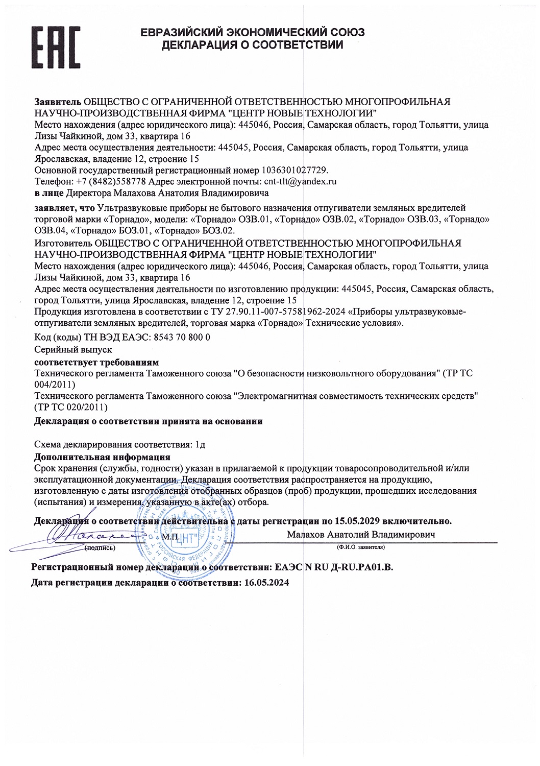 В некоторых регионах нашей страны, особенно с теплым климатом, можно встретить большое количество разнообразных змей, которые причиняют немало вреда. В дикой природе змеи очень полезны, но когда они заползают на приусадебный участок — это становится опасно для людей и домашних животных. Обеспечить надежную защиту от змей своими силами очень сложно, они прячутся в самых неожиданных местах и могут внезапно укусить оказавшегося поблизости человека. Эксперты нашего интернет-магазина предлагают современное решение данной проблемы — новую модель отпугивателя змей "Торнадо БОЗ.02". Данный прибор специально разработан для воздействия на нервную систему змей. У него в корпусе размещается генератор низкочастотного звука, а также механический мотор, создающий колебательные движения в почве. Отпугиватель не причиняет физического вреда змеям, он просто создает для них невозможные условия для обитания на участке. Змеи стремятся уползти как можно дальше от отпугивающего сигнала. Пока вы используете данное устройство змеи не вернутся. Бытовой отпугиватель змей "Торнадо БОЗ.02" эффективен для защиты дачного участка, фруктового сада, ягодника, фермерского поля и других мест.