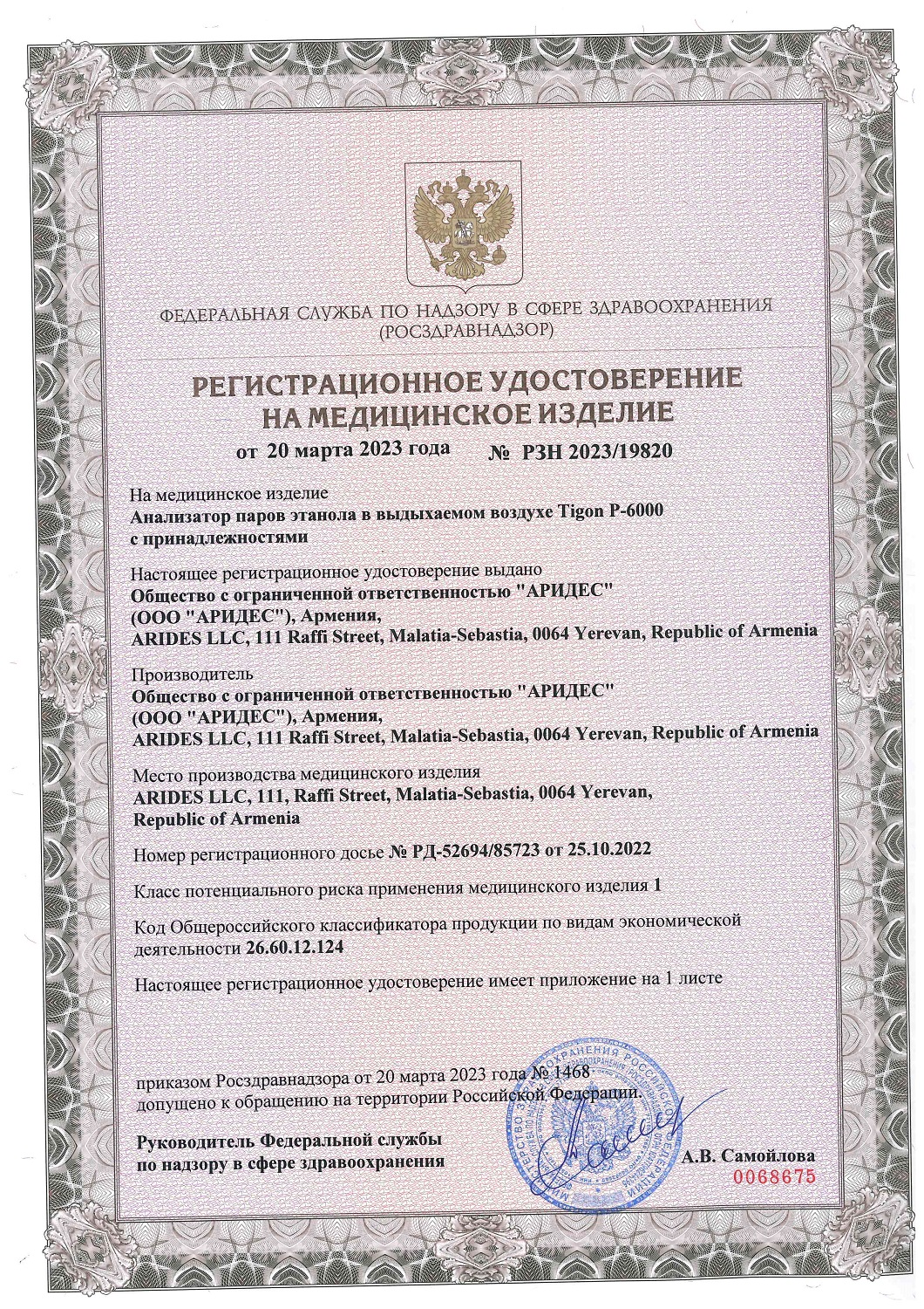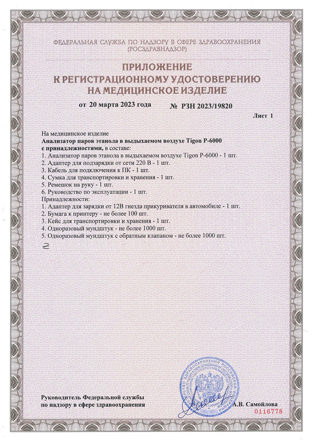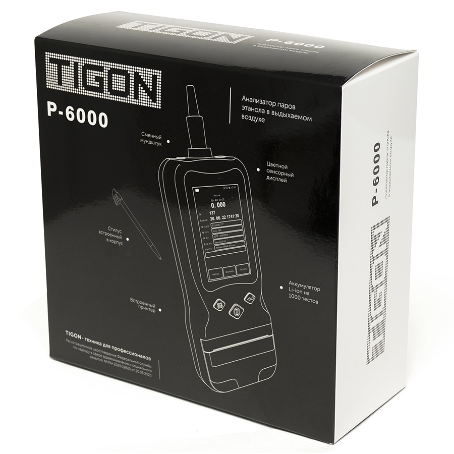 ВНИМАНИЕ! Алкотестер "Tigon Р6000" внесен в реестр Федерального информационного фонда по обеспечению единства измерений. Это зарегистрированный измерительный прибор, который можно использовать в любых организациях для проведения официального освидетельствования на алкогольное опьянение.
