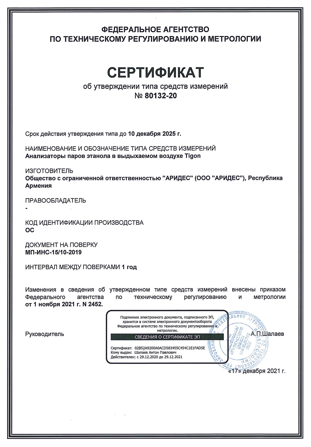 Межкалибровочный интервал | 12 мес. |