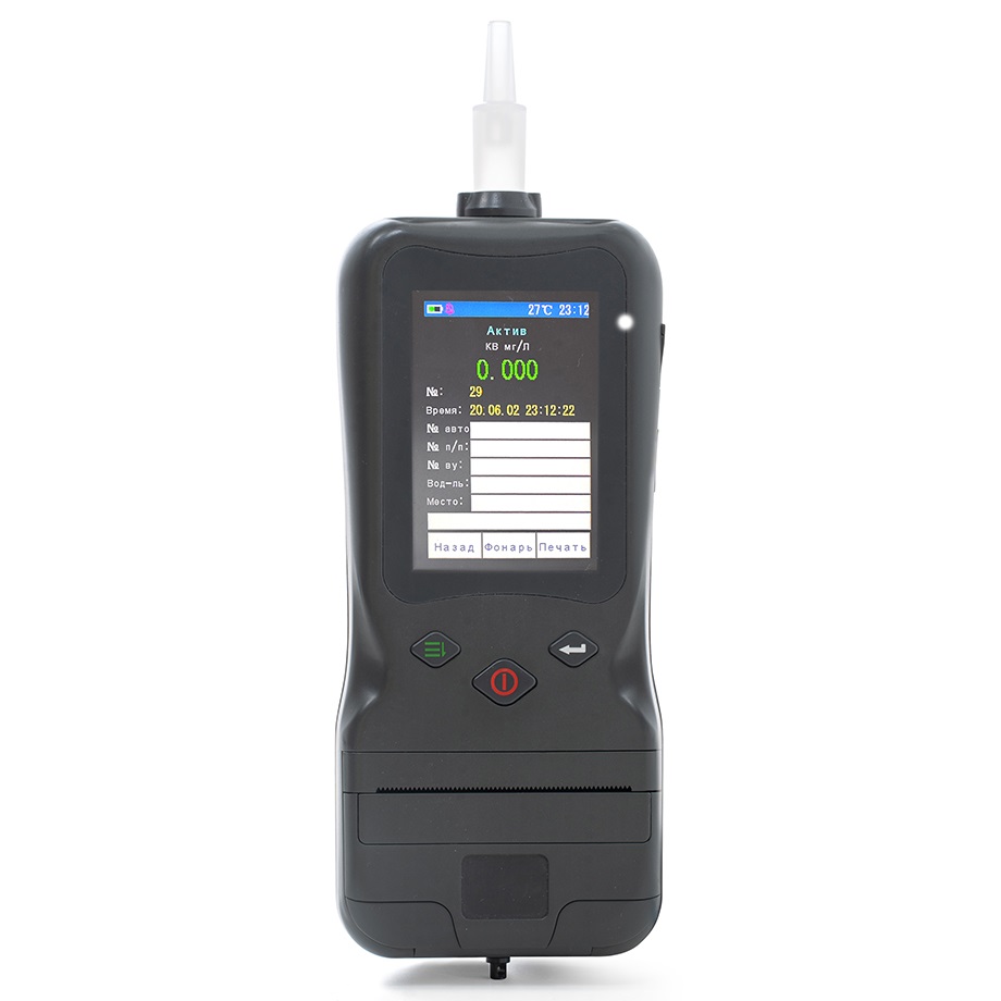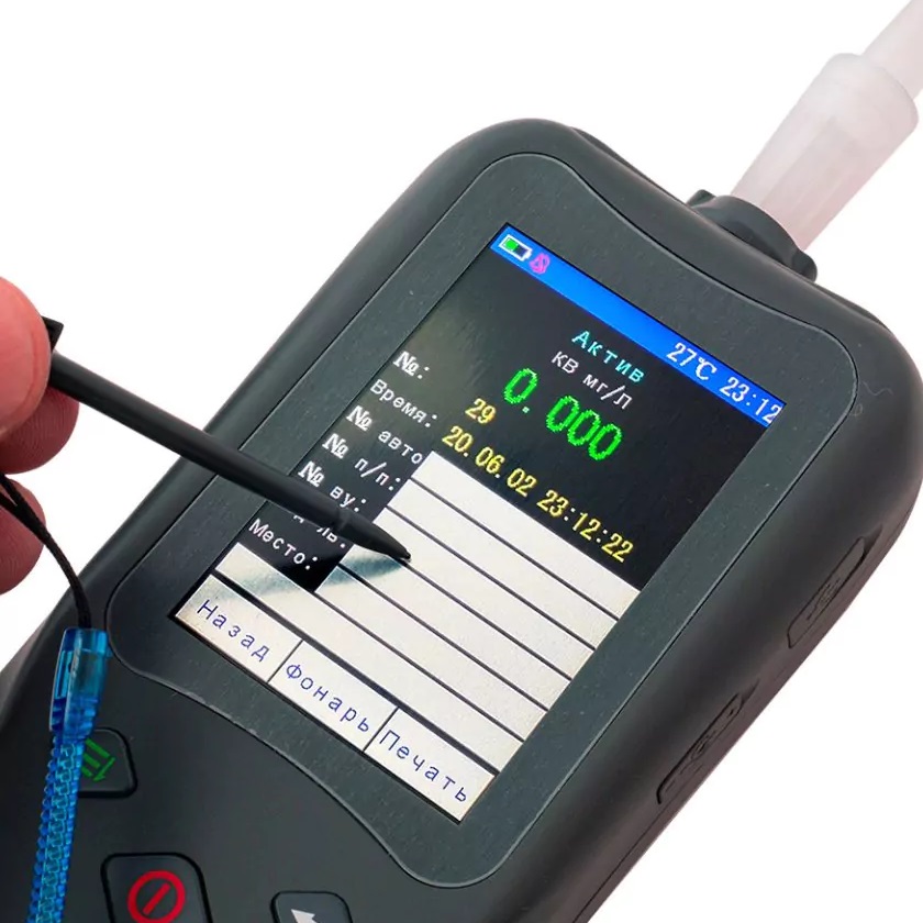 После включения прибор переходит в автоматический режим работы, датчик прогревается за 5 секунд, после чего на экране появляется надпись: "Дуйте, пожалуйста". Для проведения теста извлеките мундштук из упаковки и закрепите его в держатель в верхней части корпуса прибора. Проверяемый должен сделать полноценный выдох в мундштук. Во время отбора пробы алкотестер издает непрерывный звуковой сигнал. Когда звук прекратится, можно перестать выдыхать. Начнется процесс анализа пробы, результат появится на дисплее через несколько секунд, а также сохранится в памяти устройства. При необходимости распечатайте протокол с помощью принтера. Режим работы "Скрининг" используется для предварительной оценки состояния человека. В этом случае мундштук не нужен. В меню настроек прибора имеется пункт "Скрининг", откройте его и нажмите на кнопку "Старт" на сенсорном дисплее. Затем поднесите прибор поближе к проверяемому. Алкотестер проведет анализ окружающего воздуха. В случае обнаружения паров этанола соответствующее сообщение появится на дисплее. В этом случае нужно сделать тест с использованием мундштука.