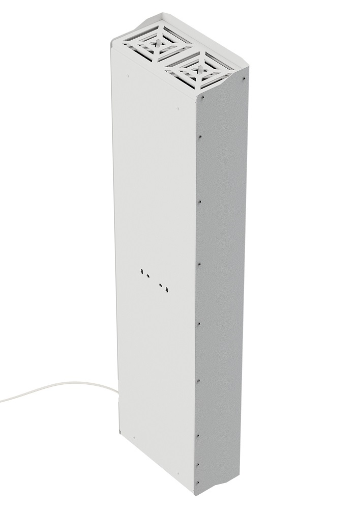 Данный прибор является универсальным, поскольку может использоваться в любых типах помещений, начиная от квартир и частных домов и заканчивая производственными цехами, складами и т.д. Производитель заявляет, что модель может эксплуатироваться в помещениях класса IV-V. Это школьные классы и детские игровые комнаты, помещения с большим скоплением людей (бытовые помещения промышленных и общественных зданий). Рециркулятор устроен достаточно просто: воздух поступает через нижнюю решетку и проходит фильтрацию от пыли и грязи. Затем он проходит внутри корпуса прибора, где облучается четырьмя УФ лампами, и возвращается обратно в помещение через верхнюю решетку, возле которой установлены 2 вентилятора для лучшей циркуляции.