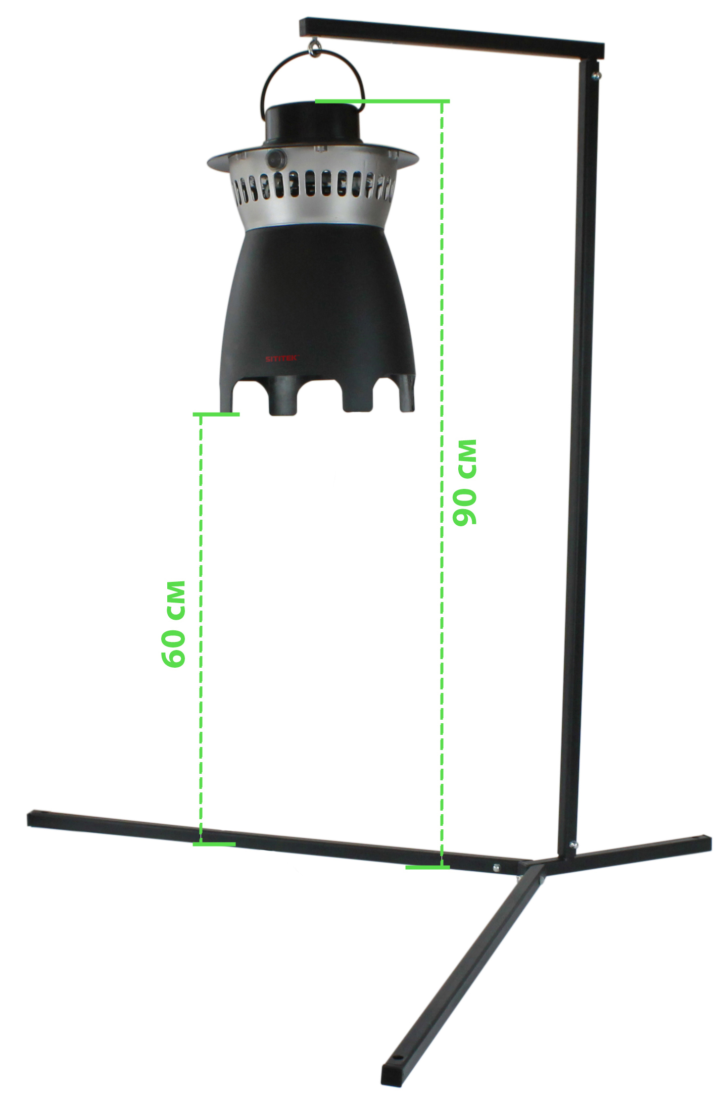Разборная металлическая стойка в комплекте. Вместе с устройством поставляется прочная стойка высотой 110 см. Она выполнена из металла и имеет разборную конструкцию. Стойка позволяет подвесить уничтожитель комаров, чтобы он мог приманивать насекомых со всех сторон.